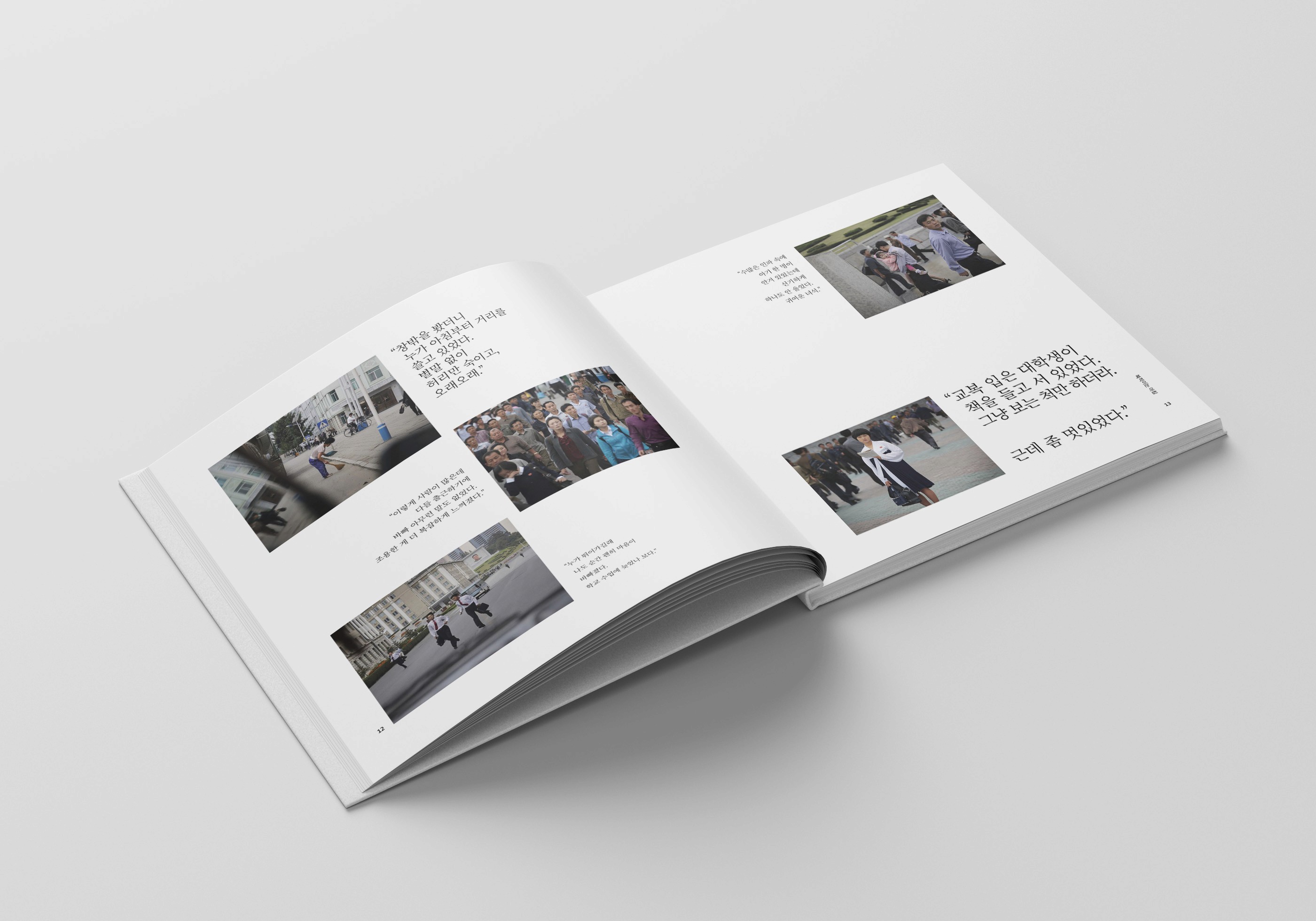 본 프로젝트는 북한을 정치·체제가 아닌 ‘일상’의 관점에서 바라보고자 한 편집디자인 작업입니다. 평양에 사는 한 소녀의 하루를 시간의 흐름에 따라 따라가며, 뉴스와 교과서 속 이미지 뒤에 가려진 개인의 삶과 감정을 조용히 보여주는 데 초점을 두었습니다. 전체 구성은 포토북 형식을 기반으로, 이미지가 먼저 시선을 이끌고 텍스트는 그 옆에서 조용히 맥락을 보완하는 방식으로 설계했습니다. 편집디자인은 Adobe InDesign을 활용해 진행했으며, 하루의 흐름에 맞춘 챕터 구성과 여백, 리듬감을 통해 차분한 분위기를 유지하고자 했습니다.